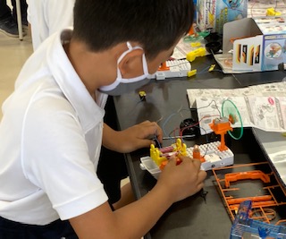 4年生が理科「電気のはたらき」を学習しています。電池の直列つなぎと並列つなぎの違いを調べました。その後は、モーターカーやプロペラカーを作って遊びました。