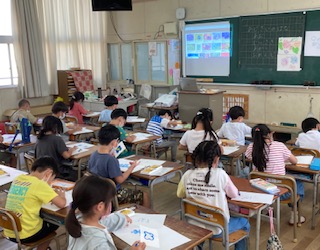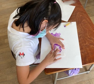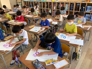 1年生が図画工作「あじさいの花」を描いています。あじさいの花の形に画用紙を切って型紙を作り、型紙のふちにパスで青、赤、オレンジ、紫色で色をぬり、指でパスをのばしてあじさいの花を描きます。とてもきれいなあじさいの花ができています。