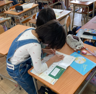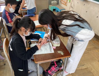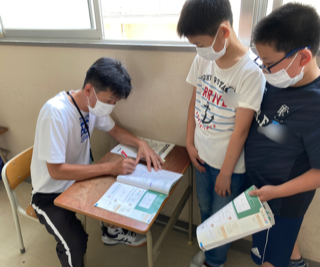4年生が算数「角の大きさ」を学習しています。廊下では、先生から教科書問題のチェックがあり、合格すると角度の問題プリントをしました。教室では、角度のはかり方、分度器の使い方などを互いに教え合いをしました。