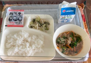 本日の献立は、マーボーはるさめ、チンゲンサイともやしの甘酢あえ、いり黒豆、ご飯、牛乳です。