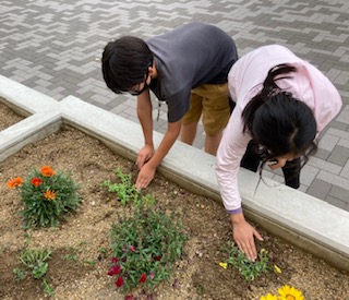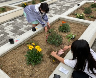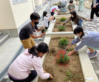 お昼休みに、環境委員の子どもたちが花の広場の花壇に、花を植えてくれました。どんな花が咲くのか楽しみです。