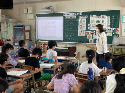 他校の栄養教諭さんに来ていただき、栄養指導「朝ごはんについて考えよう」を学習しました。朝ご飯の大切さを学び、赤(体をつくる)、黄(エネルギーのもとになる)、緑(体の調子を整える)を考えて、朝ご飯のメニューを作りました。