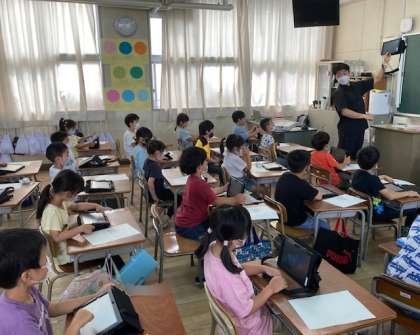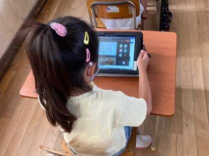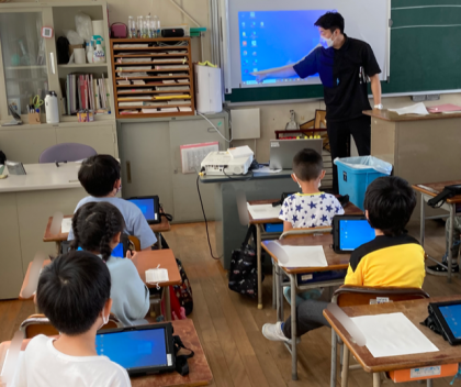 1年生が、ICT教育アシスタントの支援を得て、初めてタブレット端末を使いました。スイッチを入れ、パスワード等を入力して、Teamsに入ることができました。25日に行われる双方向通信テストに向けた練習をしました。