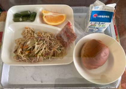 献立は、和風焼きそば、かつおぶし、オクラの甘酢あえ、オレンジ、パン(1/2)、牛乳です。