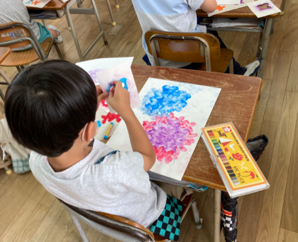 1年生が取り組んでいる「あじさいの花」ができあがってきました。カラフルできれいなあじさいので花が、教室に咲いています。