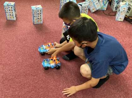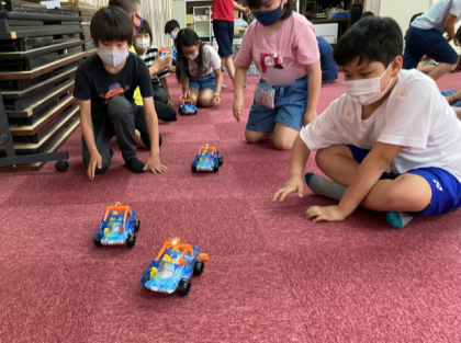 4年生が理科で電流のはたらきの学習をしています。実験で使った教材を組み立てて車を作りました。ライトもつけて第二音楽室で走らせました。