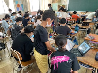 6年生がスマートスクール次世代学校支援事業として、支援員さんに来ていただき、パワーポイントの使い方や写真の保存の仕方などを学習しました。タブレット端末を使い慣れている子どもは、他の子どもに教えています。