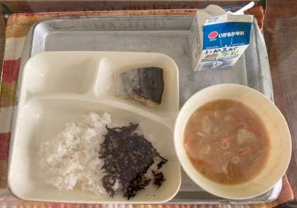本日の献立は、さごしの塩焼き、みそ汁、牛ひじきそぼろ、ご飯、牛乳です。