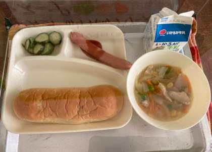 本日の給食献立は、ウインナーのケチャップソース、スープ、きゅうりのサラダ、おさつパン、牛乳です