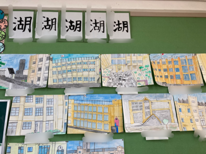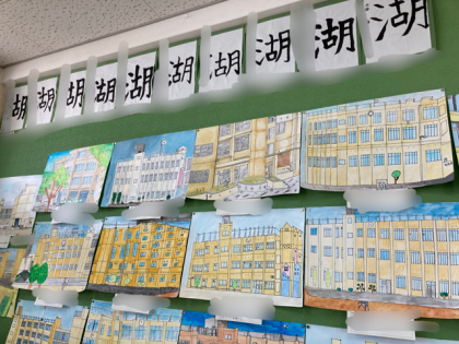 6年生の教室には、習字や校舎を描いた図画が掲示しています。また、学年掲示板には防災ポスターが掲示してあります。