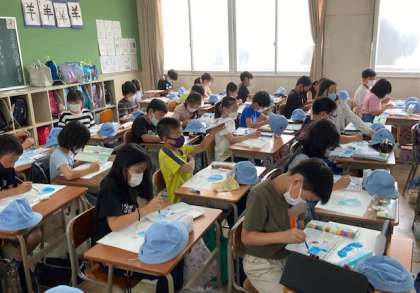 4年生が図画工作で「帽子と筆箱」の絵を描きました。ペンの線が残ること、影をつけることに注意をして、帽子に色をつけました。水の量を調節して色を塗りました。