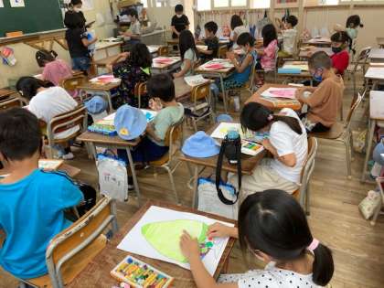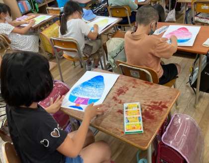 かき氷の絵ができあがりました。前時には赤、黄、青などの色をつけて氷を仕上げましたが、本時は器にパスで模様を描きました。とても美味しそうな大きなかき氷ができあがりました。