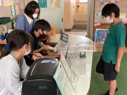昼休みに図書館を開放しています。図書委員会の児童が、本の貸出や返却をバーコードリーダーで管理しています。雨降りの日は、図書館に来る児童が多いです。