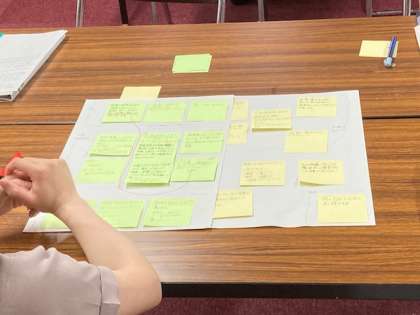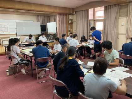 6年の算数授業を振り返り、教育センターからスクールアドバイザーの先生を迎えて、研究討議会をしました。付箋を使い、各自の意見を交流しました。講師の先生からは、具体的な改善点や今後の研究の方向性を示唆していただきました。