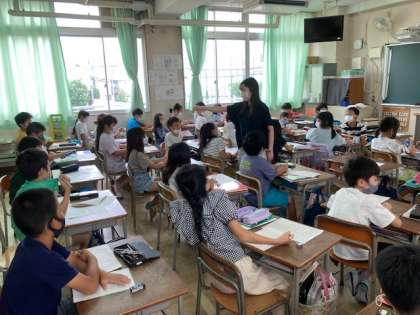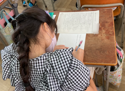 4年生が国語「お願いやお礼の手紙を書こう」を学習しています。ワークシートを使って、全文、本文、末文、後付けという手紙の書き方を学び、手紙の下書きをしました。今日は便箋に清書しました。先生からは、正しく手紙の形式が書けているお友だちの紹介がありました。