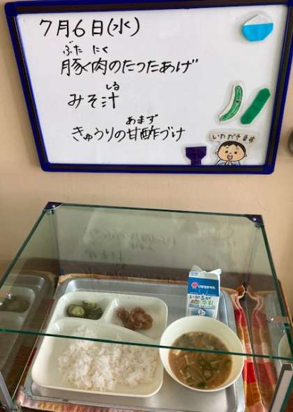 今日の給食の食材として、夏野菜であるきゅうり、かぼちゃ、オクラが使われています。オクラは高知県産です。