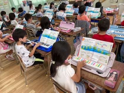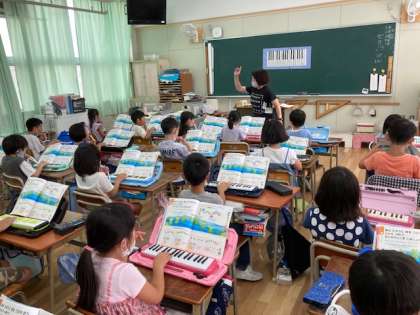 2年生が音楽「かえるのがっしょう」を鍵盤ハーモニカで演奏しました。音の高さに気をつけながら、鍵盤ハーモニカで追いかけっこをしました。