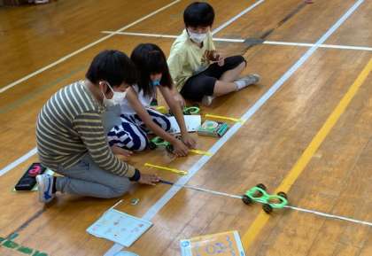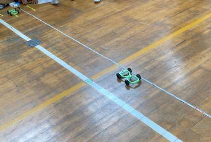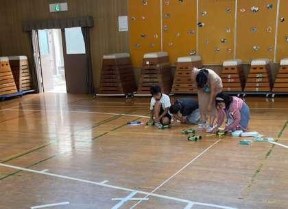 3年生が理科「風とゴムの力のはたらき」を学習しています。ゴムの力で車がどれくらい進むか、体育館で試してみました。