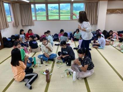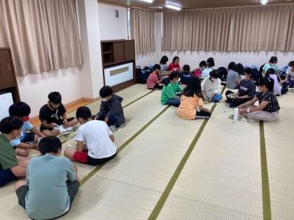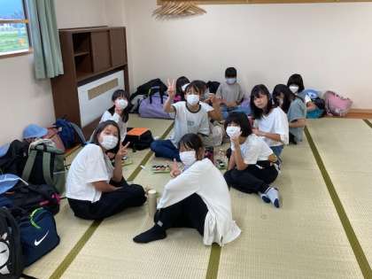 予定通り、宿舎に着きました。バス酔いの児童はなく、元気です。天候を考えて、各学級ごとに大部屋でお弁当を食べました。