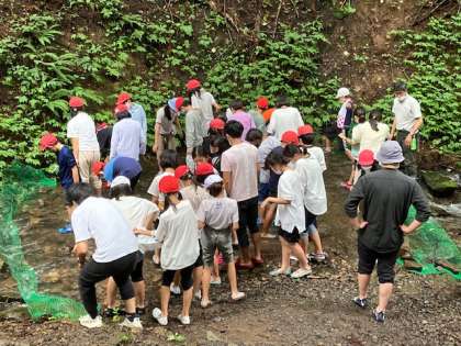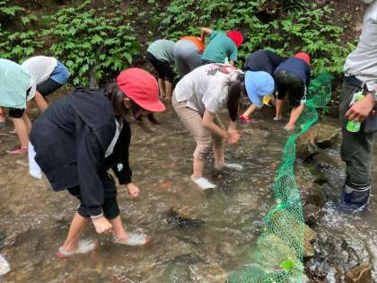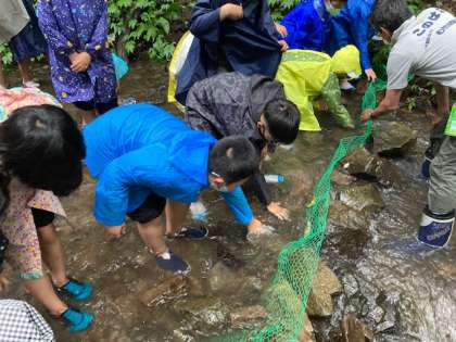 小雨の中、魚つかみをしました。冷たい水に歓声、魚をつかんで歓声と、とても楽しく魚つかみができました。