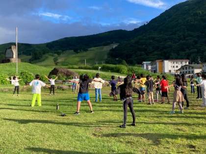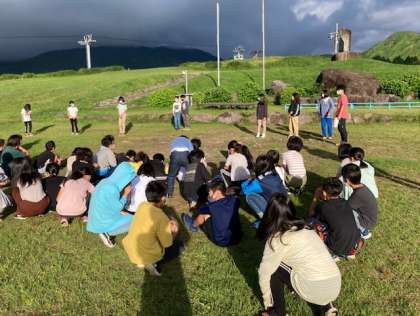 快晴です。しかし、黒い雲が見えます。山の天気は変わりやすいので、どうなるでしょうか。風が強く少し寒さを感じます。子どもたちは元気です。