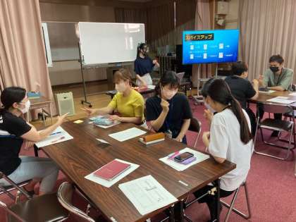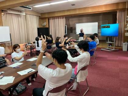 子どもの体力向上推進事業として、シナプソロジーに取り組んでいます。研修を受けた教員から伝達研修をしてもらいました。シナプソロジーとは、2つのことを同時に行う、左右で違う動きをするといった普段慣れない動きで脳に適度な刺激を与え、活性化をはかる運動です。みんなでエクササイズを考えました。