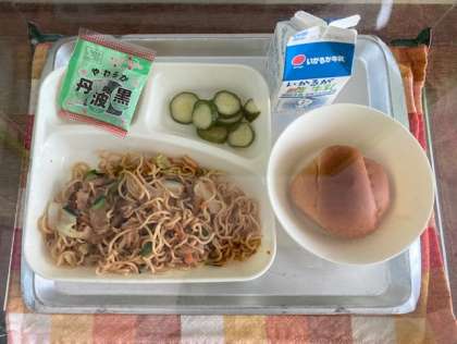 今日から2学期の給食が始まりました。献立は、オイスターソース焼きそば、きゅうりのピリからあえ、ソフト黒豆、ミニこくとうパン、牛乳です。牛乳は、からだをつくるあかの食べ物です。毎回出ます。