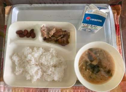 献立は、豚肉の甘辛焼き、みそ汁、金時豆の煮物、ご飯、牛乳です。