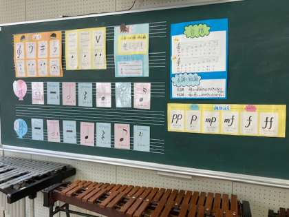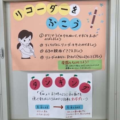 音楽室の壁面には、音符や休符、リコーダーの吹き方、楽器の種類など、学習した内容がわかりやすく掲示しています。
