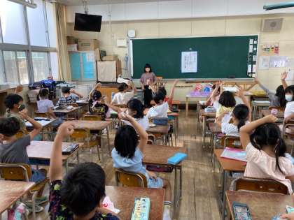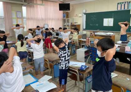各教室では、姿勢体操をしました。その後は、ハンカチ、はなかみ、石けんでの手洗いなどの点検をしました。