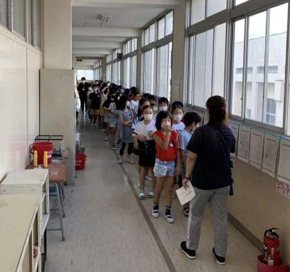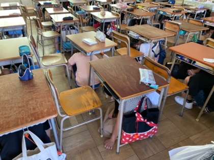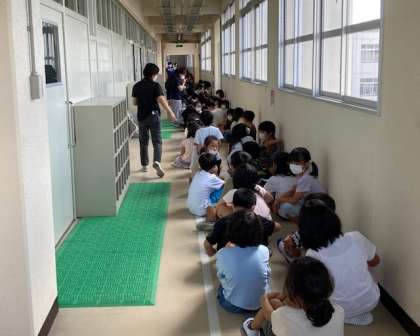 大阪880万人訓練の放送に合わせて、地震・津波を想定した避難訓練をしました。地震が発生したら、机の下に避難しました。大津波警報の時は、2階の学級は3階廊下へ避難しました。自らの身を守る行動ができたように思います。