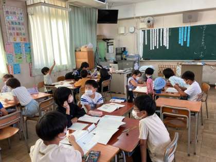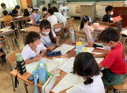 3年生が国語「グループの合い言葉を決めよう」を学習しています。司会役を決めて、合い言葉とグループ名を話し合いました。話し合う順序、司会の進め方などを学習した後は、各グループです話し合いました。