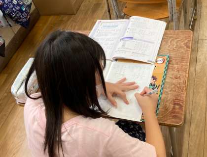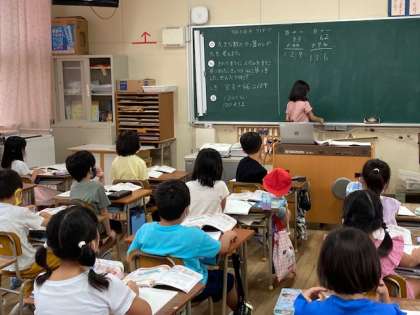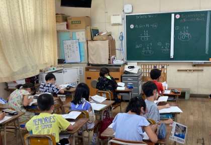 2年生が算数「大きい数の筆算の仕方」を学習しています。位をそろえて書き、繰り上がりに注意して計算しました。練習問題をしっかりとして、定着を図りました。