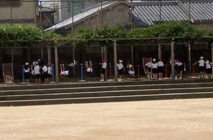 3年生の体育は、体育館、運動場、鉄棒の3か所に分かれて行いました。学校公開週間ですので、保護者の方が参観に来ています。