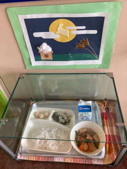 本日の給食は、月見の行事献立です。十五夜には、すすきをかざり、だんごやさといもなどをそなえ、月をながめて楽しみます。