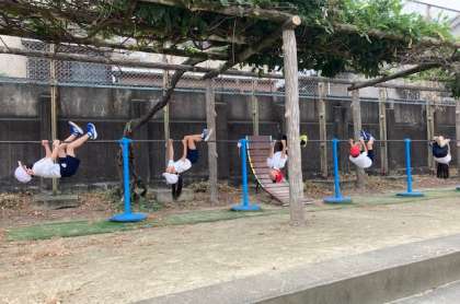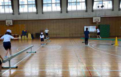 2年生の体育は、鉄棒、かけっこ・リレー、平均台の3か所に分かれて行いました。楽しく運動することができました。