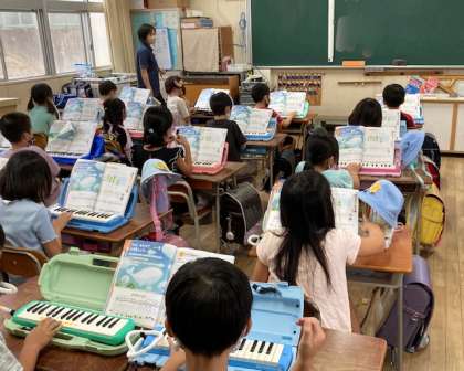 2年生が音楽で「ぷっかりくじら」の歌に合わせて鍵盤ハーモニカを吹きました。また、「かっこう」や「かえるのがっしょう」も鍵盤ハーモニカで吹きました。上手に吹いていました。