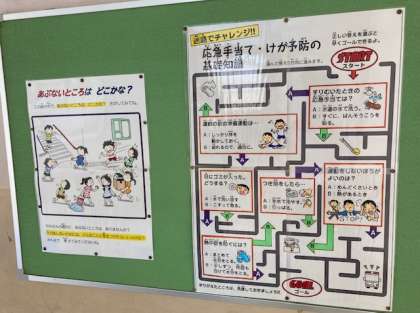 今日9月9日は「救急の日」です。応急の手当てやけがの防止の基礎知識クイズが、保健室前に掲示しています。また、保健委員会の9月のめあては「けがの防止につとめよう」です。