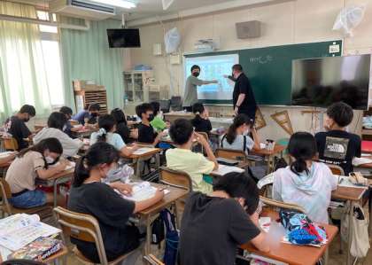 6年生がC-NETの先生と学級担任がコラボして、外国語(英語)の学習をしました。夏休みのできごとを訪ね合う学習をしました。