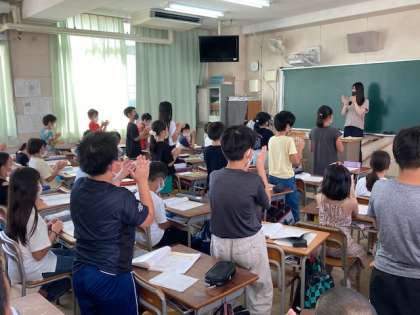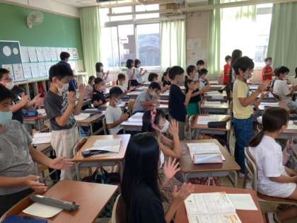 4年生が音楽「手拍子のリズムを重ねて演奏しましょう」を学習しました。となりの友だちの音をよく聞く、クラス全体の音をよく聞くという2つの耳を持って、手拍子を合わせる練習をしました。手拍子のリズムがうまく重なると気持ちいいですね。