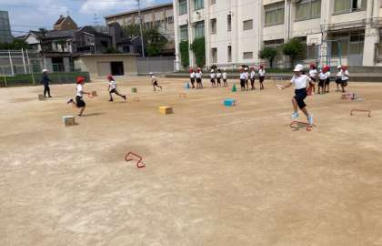 2年生が、低い障害物を用いてのリレー遊びをしました。ミニハードル、ダンボール箱をリズムよく走り、リングバトンを上手に渡していました。