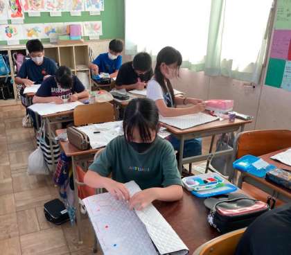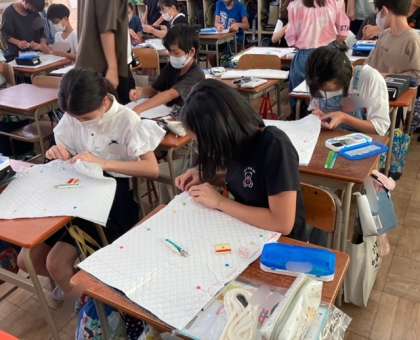 6年生がナップサック作りをしました。今日は本縫いをする前に、縫い合わせる布同士がずれないように、仮にあらく縫いとめておくしつけ縫いをしました。