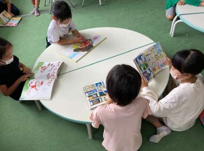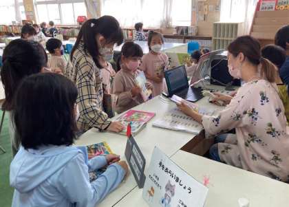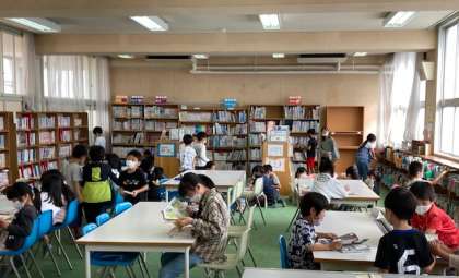 15分休みの時間に図書館を開放しています。今日は運動場が使えないので、図書館に来る児童が多かったです。学校図書館ボランティアさんが図書の貸出を担当してくださいました。