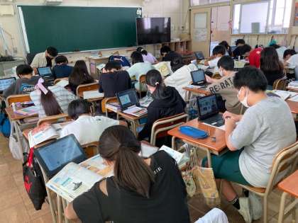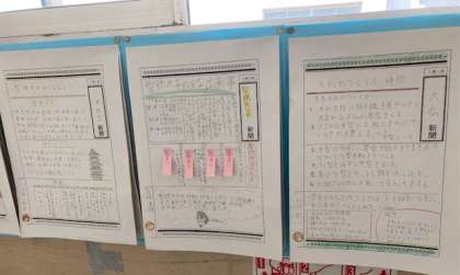 6年生が社会科で歴史新聞を作成しています。インターネットや資料集を活用して、調べたことを新聞にまとめました。廊下にはこれまでの歴史新聞が掲示してあります。