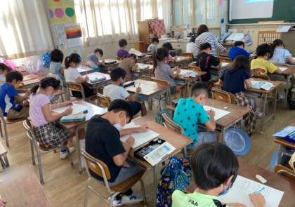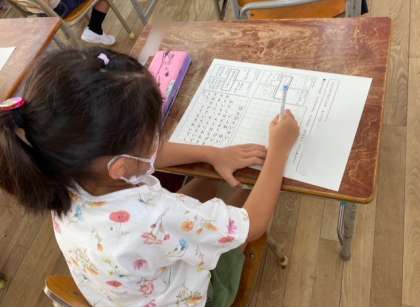 1年生が国語で視写をしました。左側の作文を右側の原稿用紙に書き写しました。ひとマスあけて書き始めることなどに注意して丁寧に書きました。