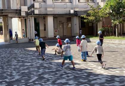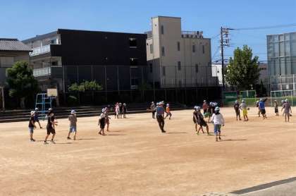 秋の穏やかな空が広がり、過ごしやすい体感です。運動場ではドッジボール、花の広場では「だるまさんが転んだ」をして遊んでいます。