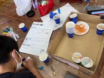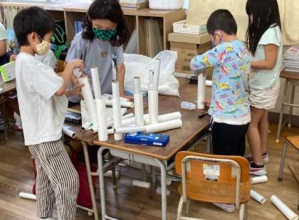2年生が生活科の学習で、おもちゃづくりをしています。設計図を作り、設計図に基づいて、おもちゃを作っています。できあがりが楽しみです。