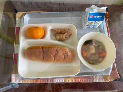 今日の献立は、あげぎょうさ、鶏肉と冬瓜の中華煮、冷凍みかん、さつまいもパン、牛乳です。