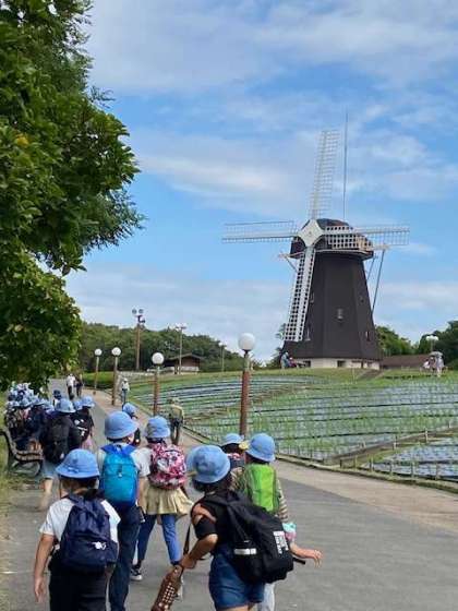 大きな風車を見て、子どもたちは「外国みたーい」と喜んでいました。