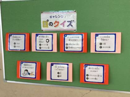 本校では、保健室前に健康に関することが掲示しています。今月は「目のクイズ」が掲示しています。子どもたちが楽しくクイズに答えながら、健康のことを学んでいます。